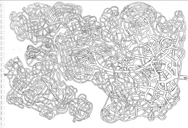 Antimappa dei Territori Sublimi > Copia su pergamena di un’antica mappa, conservata presso la Bibliotheca Antiqua della città di Lup, che si riporta qui in visione (i labirinti sono percorribili in cerca dell’uscita). (p. b.)