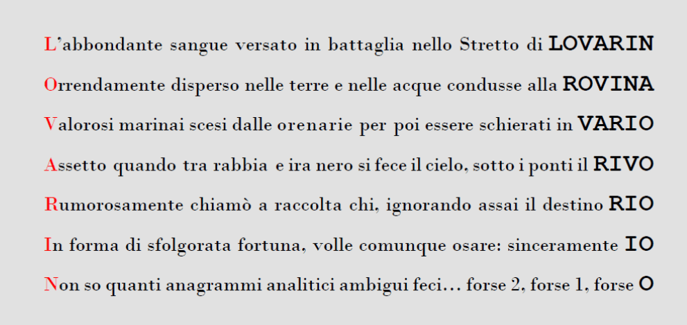 Sul tema si riporta anche una composizione con un acrostico, un anagramma a scalare e un bifronte disperso nel testo.